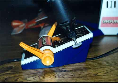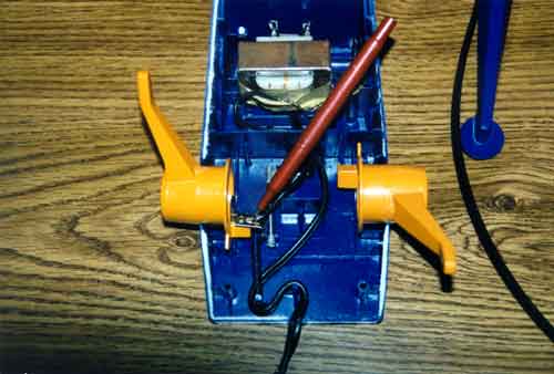 Now for the easy part. See that transformer? If you have a meter, you can check the voltage (careful!). It seems to be a standard size ... shouldn't be hard to replace. I don't remember what the output voltage is. Even more obvious. See where the pen tip is? That black wire should be crimped to that brass connector. If it isn't, you found your problem! I soldered mine so that it wouldn't happen again. But notice how the wire is attached to a constantly moving part. Even worse, the crimp job was lousy. In mine, the wire simply slipped out of the crimp connector! I'll bet this baby failed the day the poor kid got it! Sure seems like there was a better way. Also notice what the rivet on the bottom of the unit held in. Sure glad we didn't drill it out. If it was drilled out, simply replace it with a nut and bolt. While you are in here, may as well lube this thing up. I sprayed some WD-40 in the tube that connects with the pylon. It worked wonders! The controls move much more smoothly now.