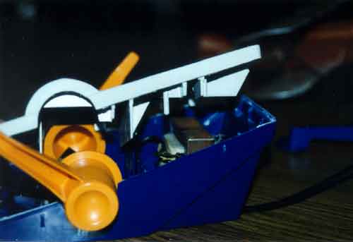Look at the side of the control box. Notice where the blue and white sections meet. The "line" where they meet is where we are going to cut. The white and blue portions of the box are glued internally below this seam. At this point you may want to try gently cutting the box open with the knife and gently prying with a small screwdriver. If you are lucky, the glue may be thin and you may get away with little or no cutting. This was not the case with my Dareplane. Even if you do need to cut with the Dremel, you may reduce the amount of work needed by cutting and prying the loose sections. Take care when you cut and pry. It's easy to hack the plastic with knife slips. It is equally easy to cause stress marks if you get too brute with the screwdriver. Start the Dremel up and slowly push the cutting wheel into the box on the seam. You can push it in most of the way, but don't let the spinning shaft hit the plastic case. Most of the moving parts and wires are too far recessed to be hurt by the cutting (see figure for step 6). Be careful not to twist the Dremel if you can. That will result in a broken cutting wheel and possibly nicking the side of the box. Don't be alarmed if the wheel breaks - that WILL happen. The cutting wheels come in a bottle of twenty five or so. Just replace it and move on. Cut slowly and in short increments. Don't try to cut it all at once. Be careful when you get near the levers and box corners. You may have to stop a little short and pry the plastic apart. I think the corners were the hardest. The plastic bond was very strong, and it was difficult to cut or pry. In the end, I just carefully cut through them. Don't pry too hard or you will end up putting stress marks in the plastic! You will have to cut deep into the box. As you can see from the pictures in step 6, there are additional supports that need to be cut. These are not entirely on the edge of the box. In fact, some are in the center, out of reach of the cutting wheel.